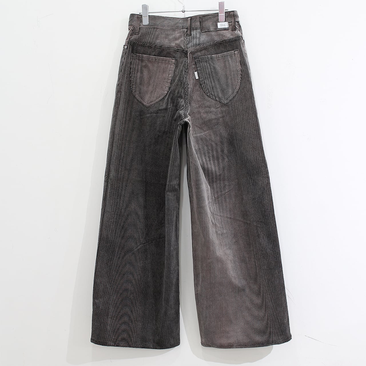 - 無数の線の重なりで生み出されるモアレ模様を抜染(ブリーチ)によって表現したコーデュロイパンツ