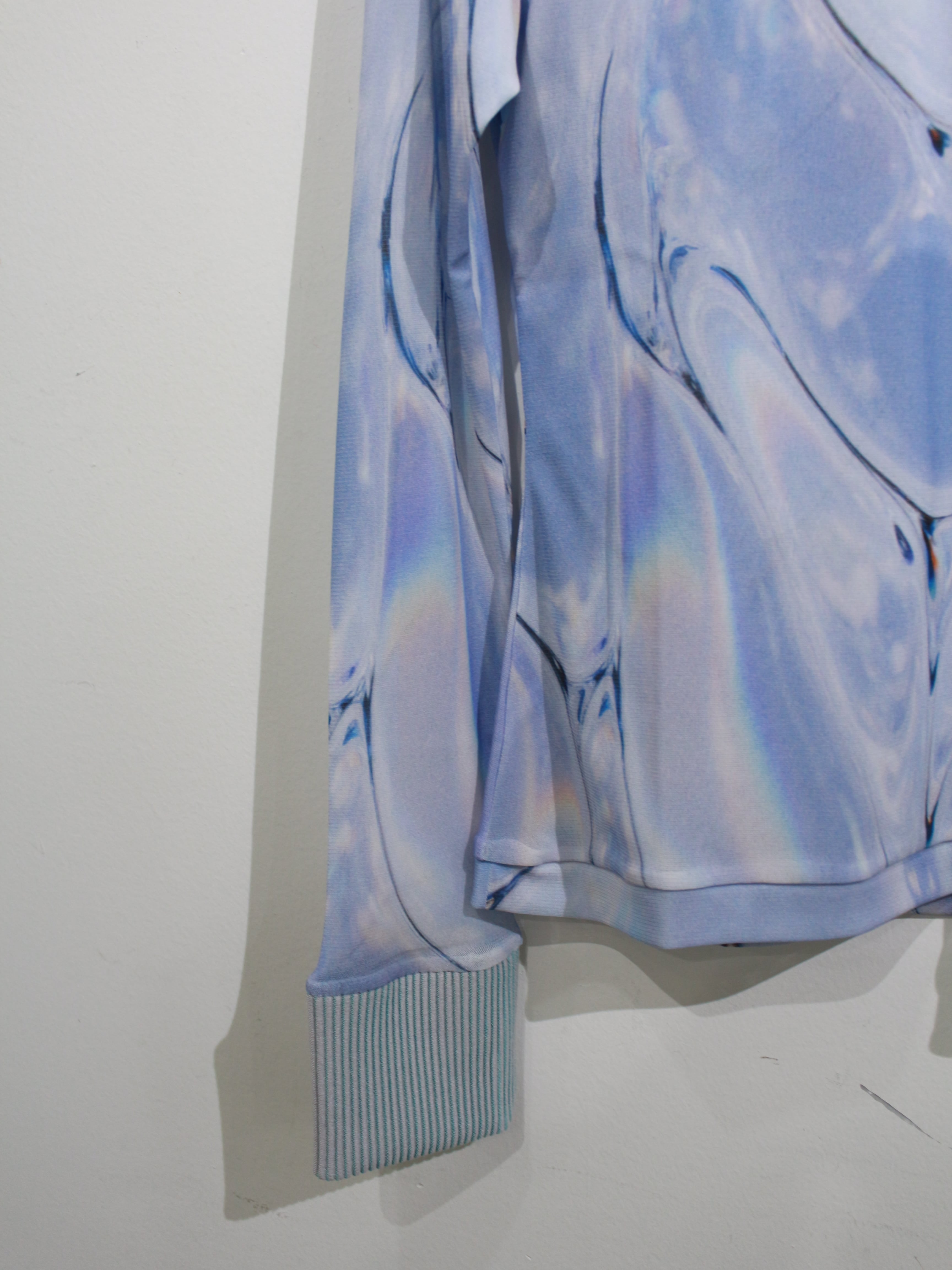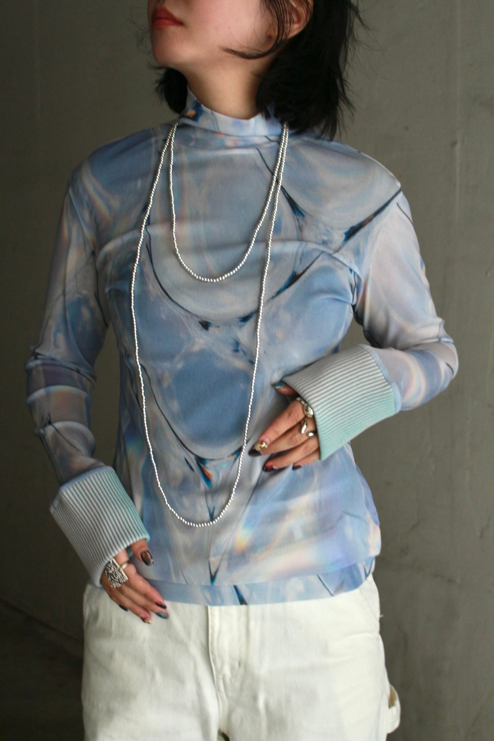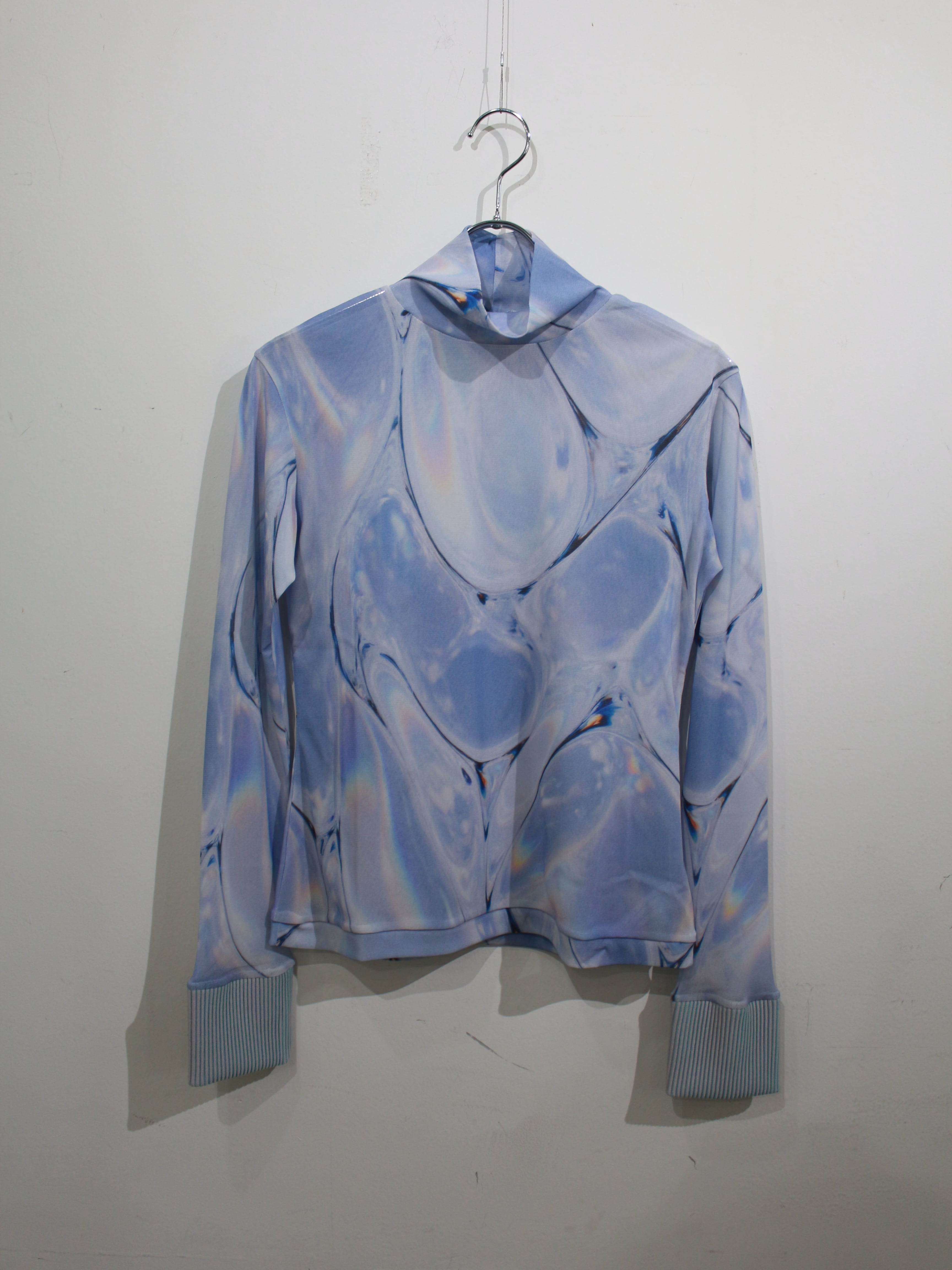 光が溶け込み、青のヴェールが身体の輪郭をかすめるようなトップスです。