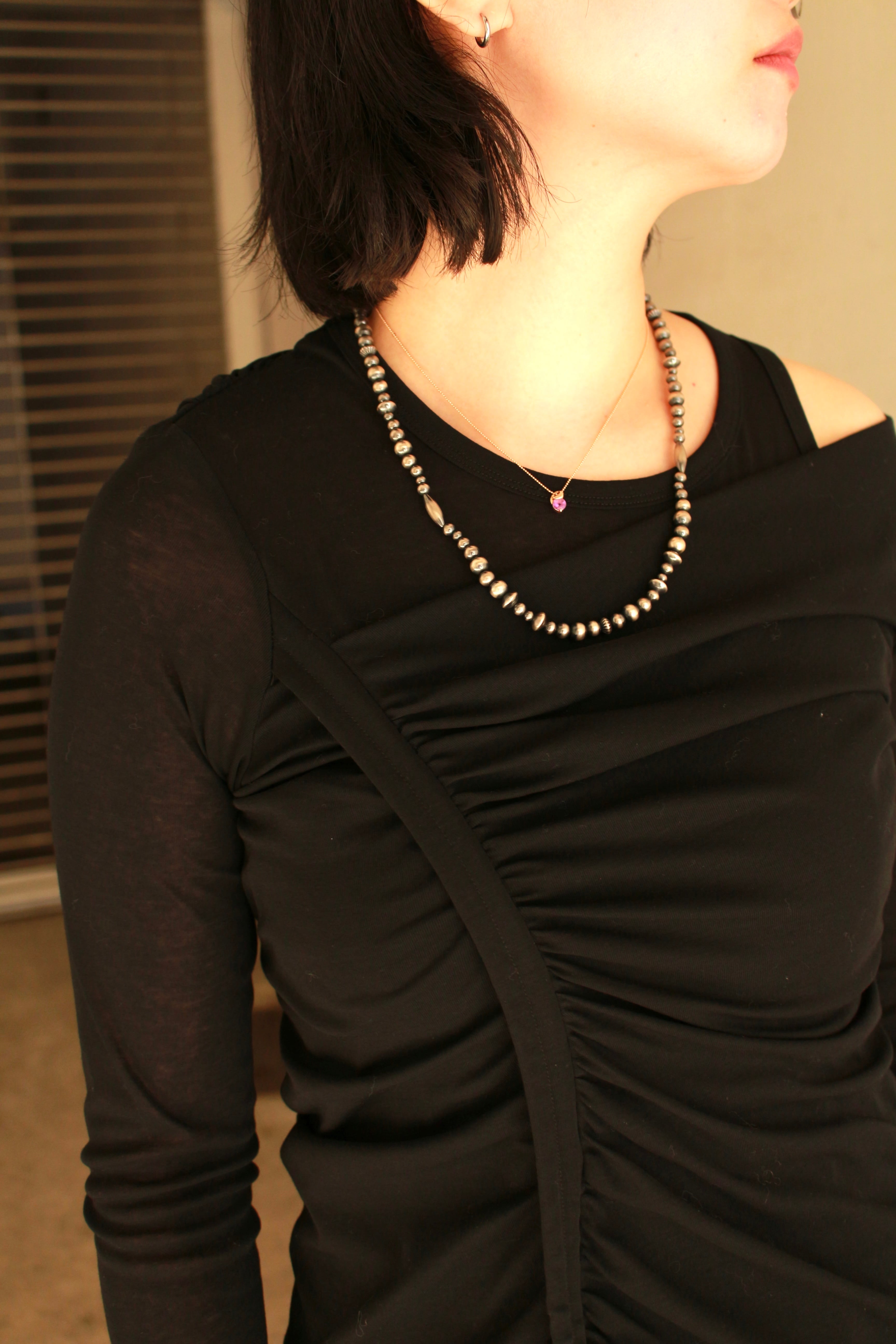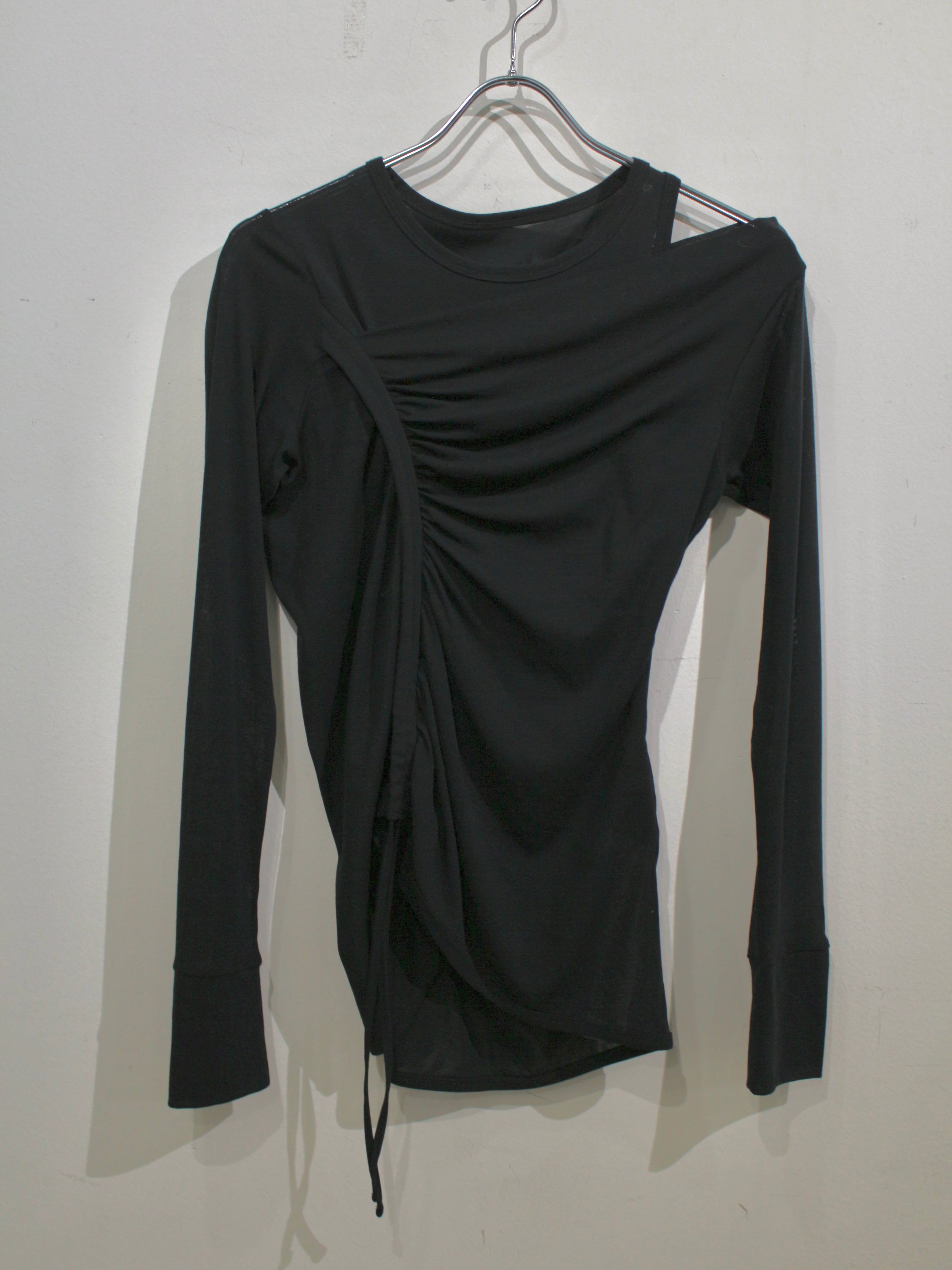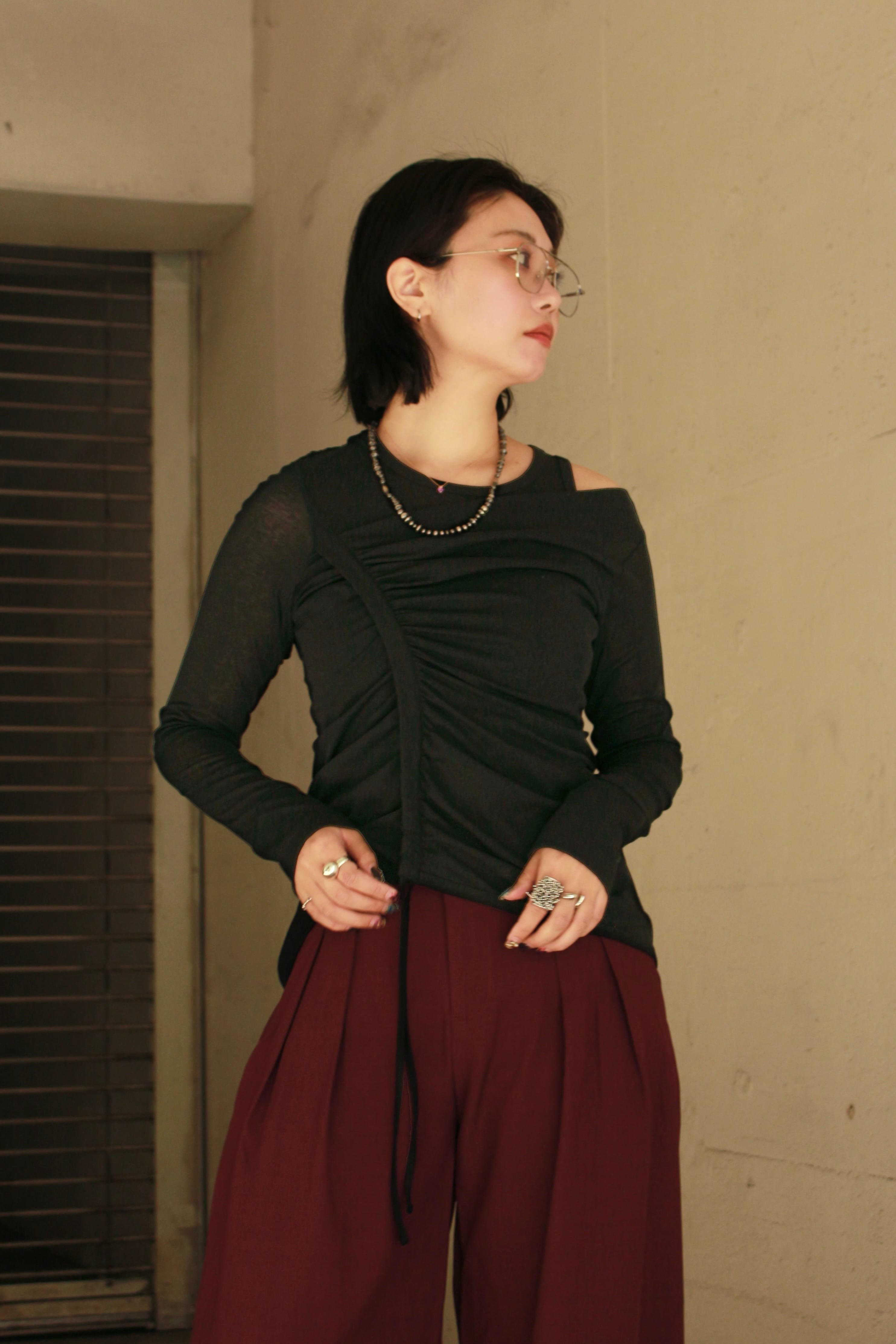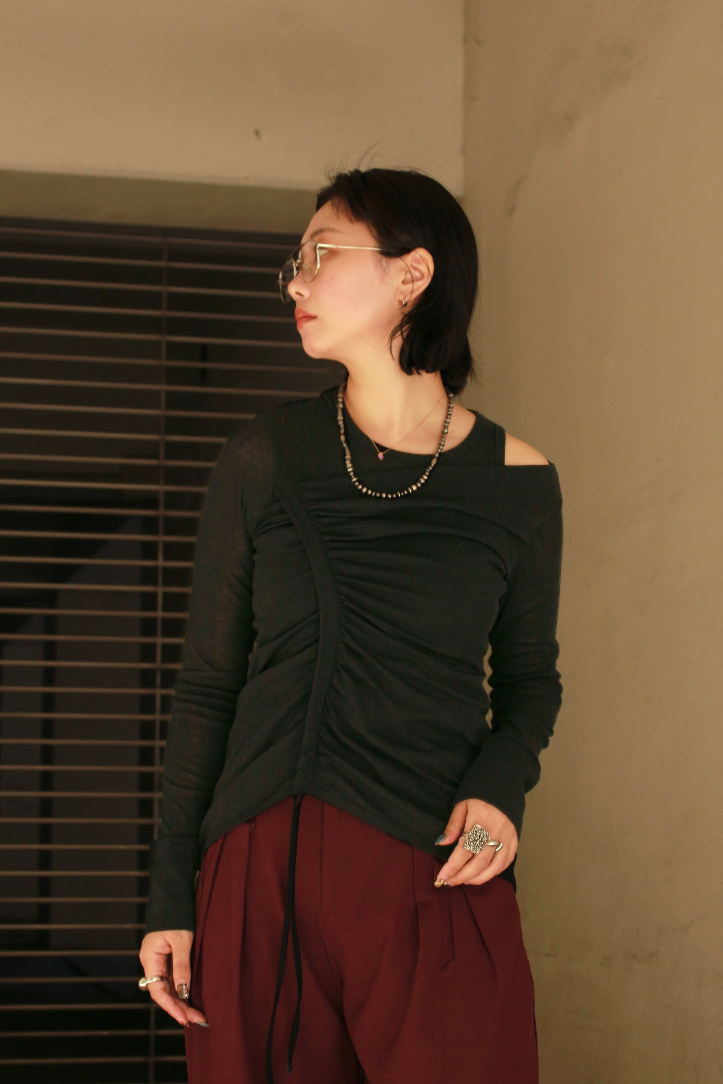 アシンメトリーなドレープが体を覆う